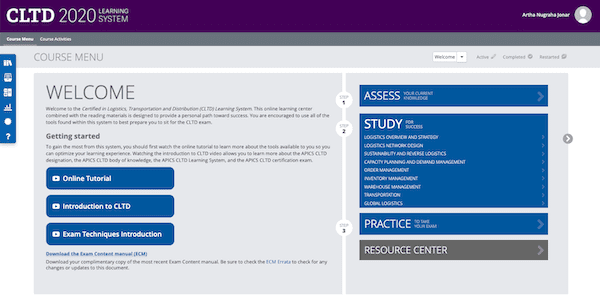 Yang pertama, saya mendapatkan APICS Learning System untuk materi CLTD tahun 2020. Learning System ini akan berlaku selama 12 bulan. Kemudian di dalam Learning System tersebut, ada 3 bagian besar yang merupakan panduan langkah demi langkah yang disarankan oleh APICS, antara lain: