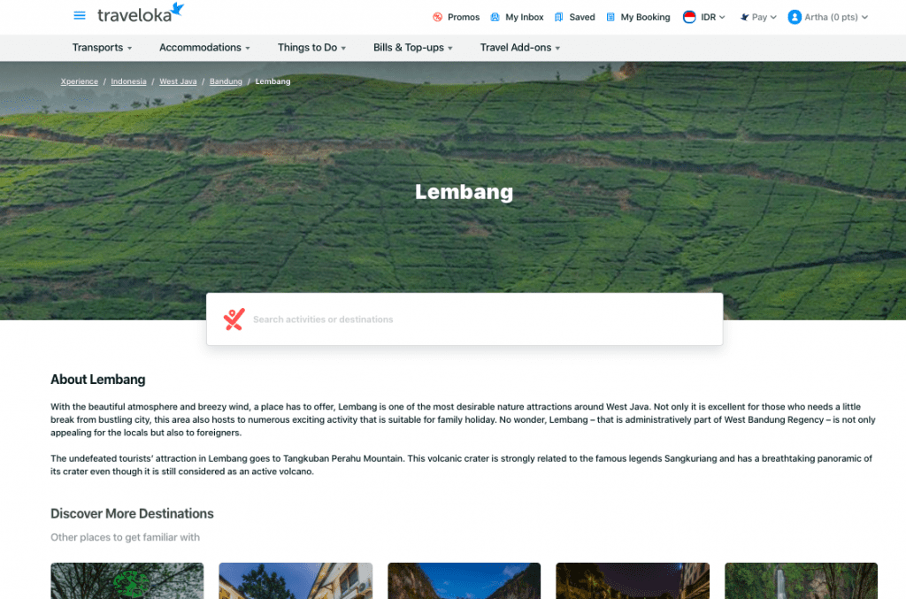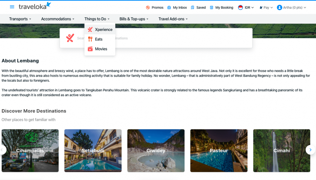 Memang Traveloka ini sangat bisa dijadikan andalan. Tapi tunggu dulu tidak cukup hanya itu saja. Traveloka ini juga mendukung pembayaran tempat-tempat wisata yang akan kita kunjungi. Seperti misalnya rencana saya ke Lembang, saya bisa membeli tiket masuk berbagai tempat wisata di Lembang. Caranya, tinggal memilih menu Things To Do, kemudian pilih Xperience. Selanjutnya ketik kata Lembang. Kemudian kita akan mendapatkan daftar informasi berbagai tempat wisata di Lembang.