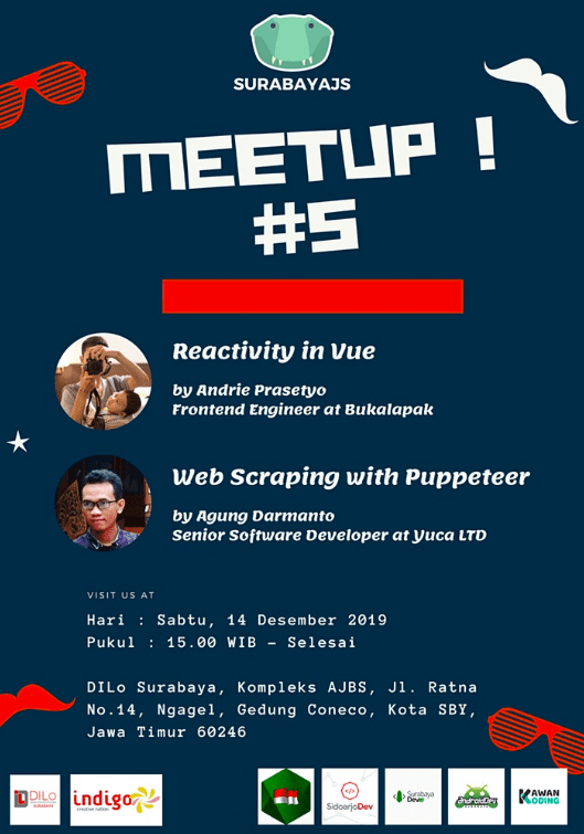 Topik meetup kali ini cukup seru. Topik pertama yaitu “Reactivity in Vue” disampaikan oleh mas Andrie Prasetyo, Front Engineer dari Bukalapak. Sedangkan topik yang kedua adalah “Web Scraping with Puppeteer” yang disampaikan oleh mas Agung darmanto, senior software developer Yuca ltd.