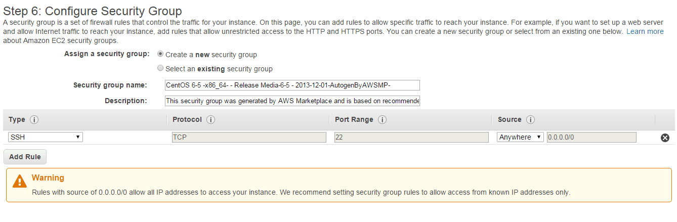 Langkah keenam, melakukan konfigurasi grup security. Untuk awalnya yang dibuat  satu tipe dahulu untuk SSH atau port 22.