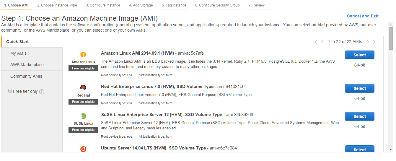 Setelah itu kita akan masuk ke dalam panduan membuat sebuah instance. Instance atau virtual server dibuat dengan sebuah image / Amazon Machine Image (AMI) yang berisikan system operasi atau aplikasi yang kita kehendaki. Kita bisa memilihnya melalui AWS market place atau community AMIs.