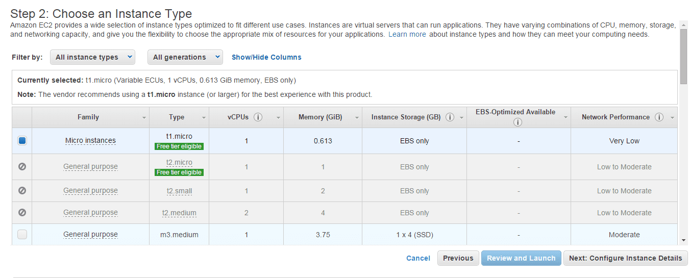 Berikutnya adalah memilih type instance. Type instance ini tergantung pada VCPU, memory dan storage yang kita pilih sesuai kebutuhan.