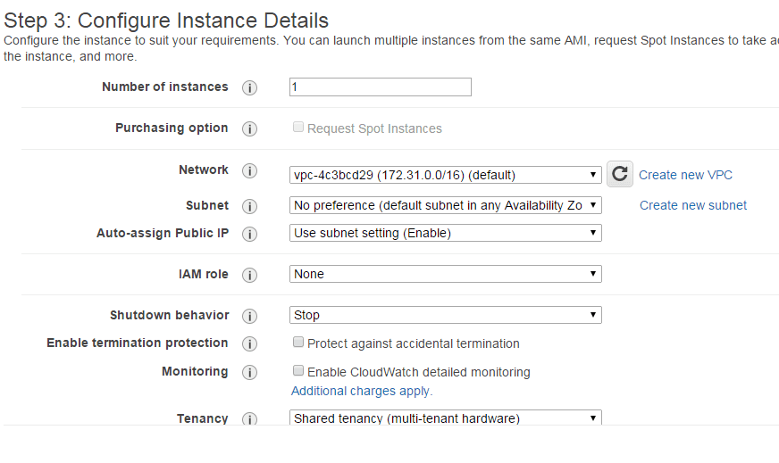 Untuk configure instance details saya membiarkan dalam posisi default