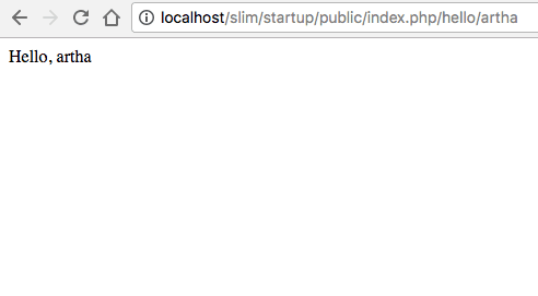 Berikutnya, silahkan buka di browser dengan alamat dari tempat slim framework di setting. Jika tidak ada pergantian konfigurasi bisa dibuka di http://localhost/startup/public/index.php/hello/artha
