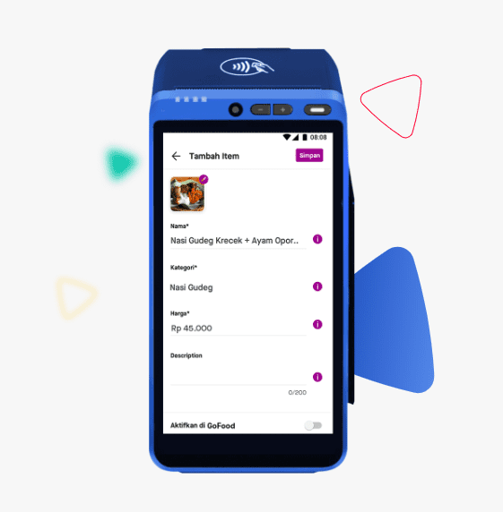Kamu dapat menambahkan item apa saja yang kamu jual di mesin EDC ini. Atau jika outlet kamu sudah terdaftar di GoFood kamu bisa impor menu outletmu yang ada di GoFood. - Terima Pesanan GoFood