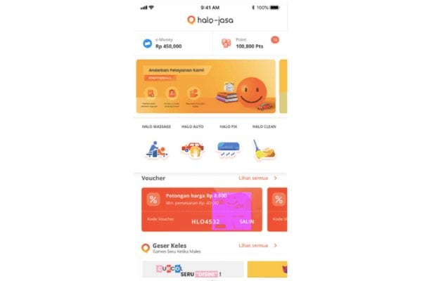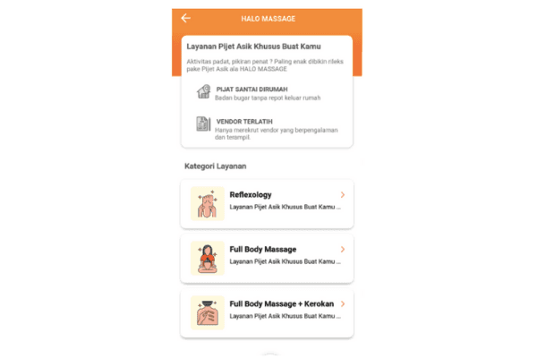 Halo Jasa adalah aplikasi jasa yang bisa dipesan via aplikasi Android dan IOS. Kamu tinggal cari nama aplikasinya, baik di Google Playstore ataupun IOS Appstore. Aplikasi ini mempunyai 4 layanan. Selain Halo Massage, yang jadi tempat kamu memesan jasa reflexology massage, ada juga jasa lainnya yaitu, Halo Clean, Halo Auto dan Halo Fix.