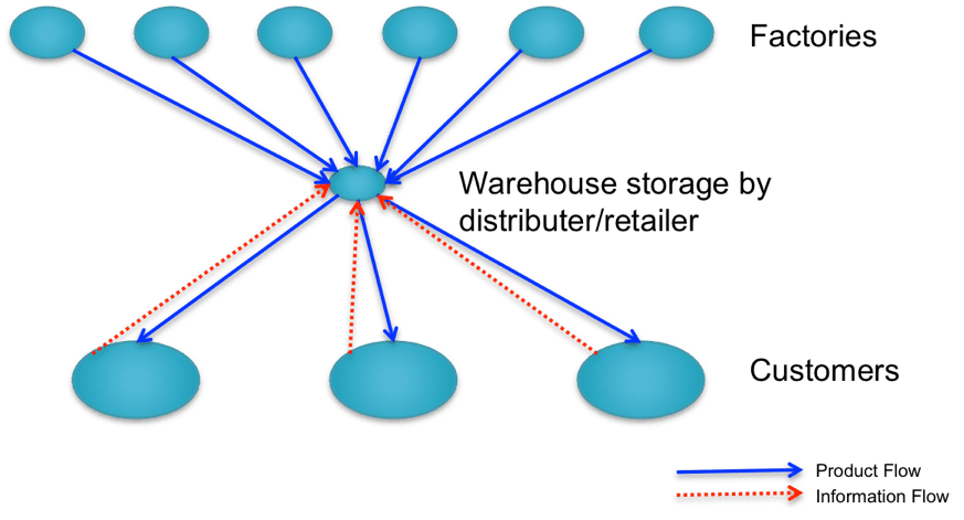Metode yang kedua adalah pengiriman barang melalui warehouse/distribution center. Dengan metode ini, maka barang akan dikirimkan terlebih dahulu ke warehouse atau distribution center. Warehouse atau distribution center ini merupakan tempat penyimpanan yang akan melayani pengiriman untuk area yang luas. Menggunakan metode ini cocok untuk barang dengan karakteristik barang tahan lama, mempunyai jumlah besar dan barang dengan ketidakpastian antara pasokan dan permintaan yang tinggi.