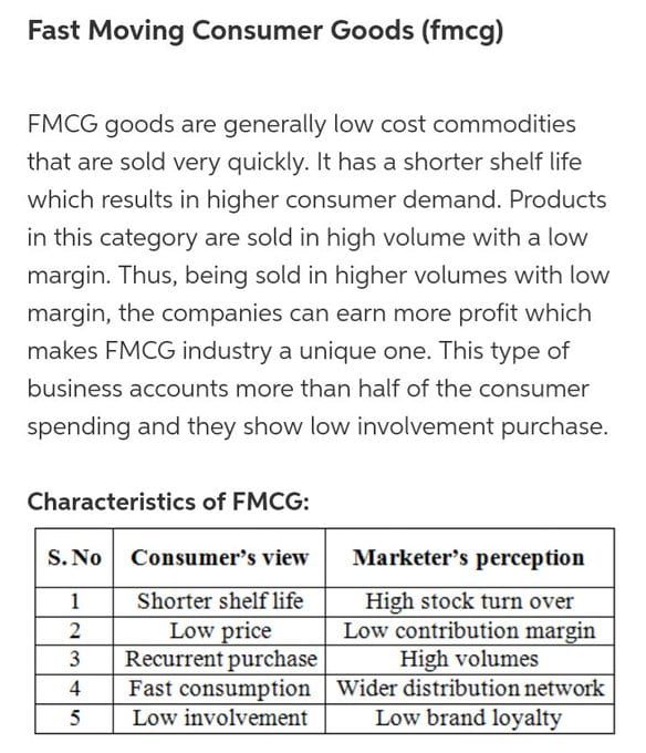 Dari halaman chegg.com, customer memandang bahwa produk FMCG merupakan barang yang bersifat murah, cepat habis dan pilihannya banyak. Hanya dari sisi marketing melihat ada challenge antara beban turn over produksi tinggi, volume kuantiti di pasar yang melimpah, akan tetapi customer tidak loyal karena banyaknya pilihan produk lainnya.