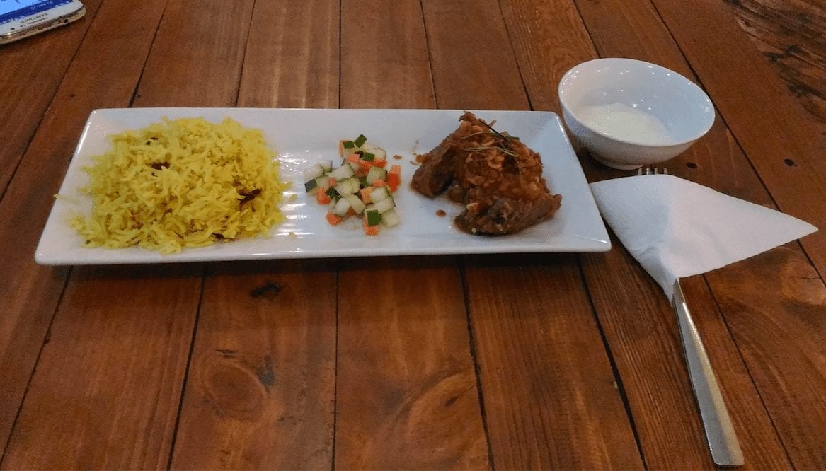 Setelah memilih-milih, akhirnya kami memesan nasi Biryani, mineral water dan orange lemon sparkling. Saya memilih nasi biryani karena penasaran gimana sih rasanya. Di menu dituliskan kalau makanan ini berasal dari india. Setelah saya googling dari wikipedia, ini ternyata ini nih yang dinamakan nasi biryani.